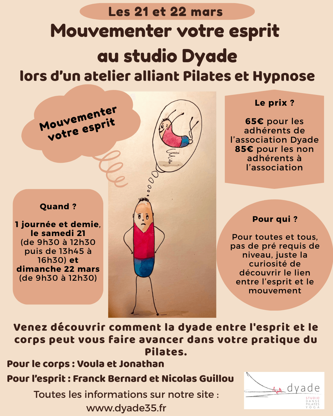 Franck Bernard et Nicolas Guillou, médecins formateurs en hypnose, vous accompagneront, avec Voula et Jonathan, pour mouvementer votre esprit et votre corps lors d'un atelier alliant hypnose et Pilates.Découvrez comment renforcer le lien entre le corps et l'esprit