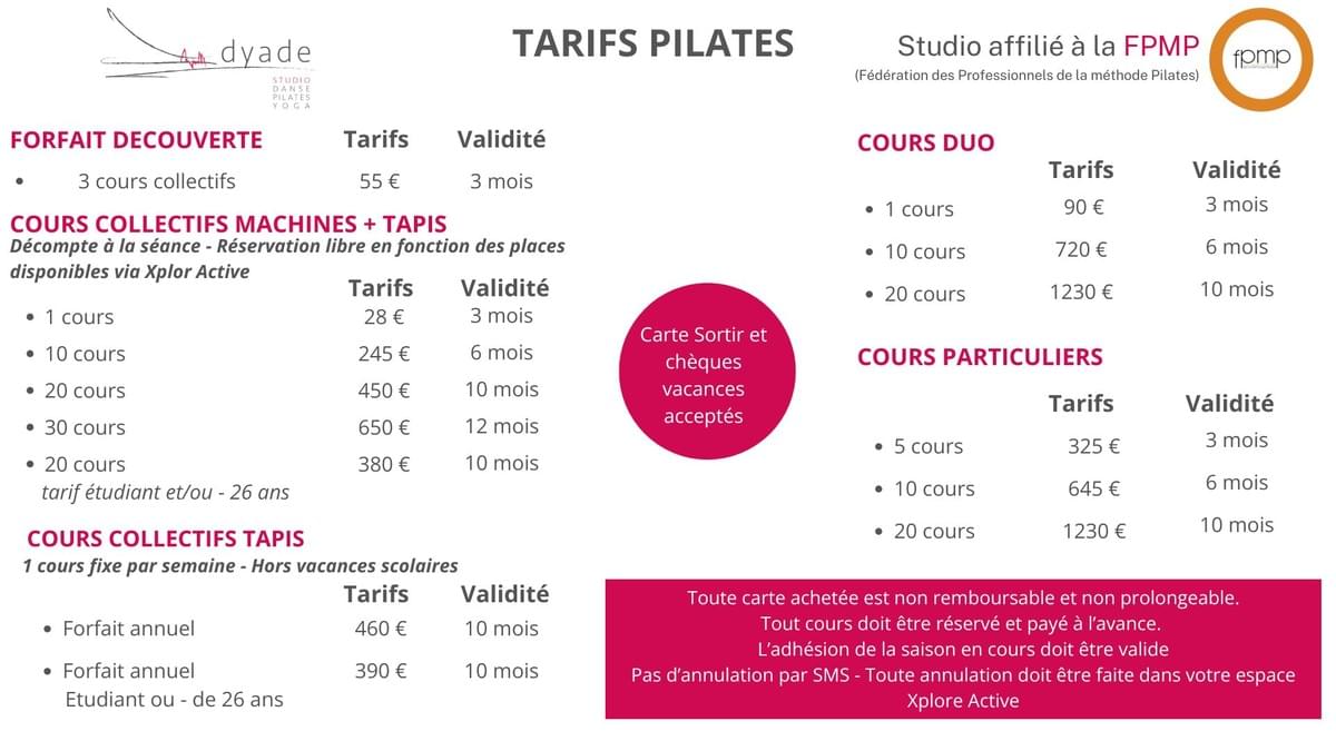 Tarifs Pilates 2025-2026